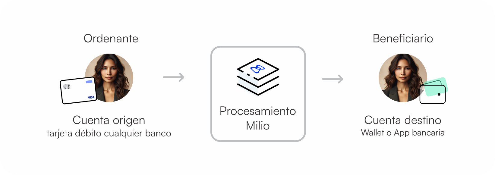 - Open Link: El usuario solicita a un tercero que le realice una transferencia. Para ello, genera un enlace único que puede compartirse por WhatsApp, SMS u otros canales. La persona que recibe el enlace, al abrirlo, se registra en la plataforma, selecciona su medio de pago y completa el envío del dinero a la tarjeta que el usuario solicitante definió desde el inicio. Es importante resaltar que toda la información del remitente (quien envía el dinero) es tratada siguiendo las políticas de seguridad y protección de datos vigentes.