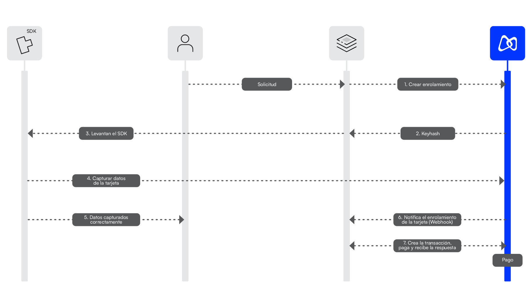 El SDK gestiona automáticamente la comunicación, validaciones, captura segura de datos y retorno de información al sistema, permitiendo ofrecer una experiencia de usuario fluida y segura, sin que el cliente tenga que abandonar la aplicación o sitio web.